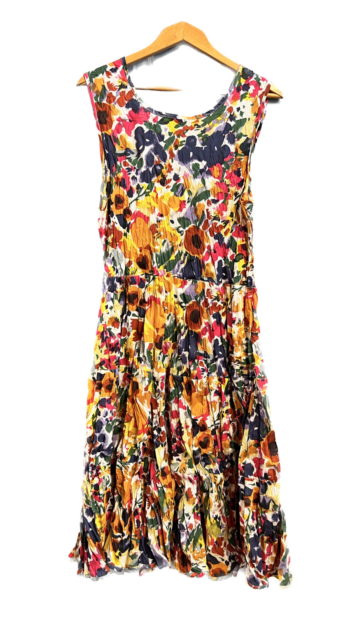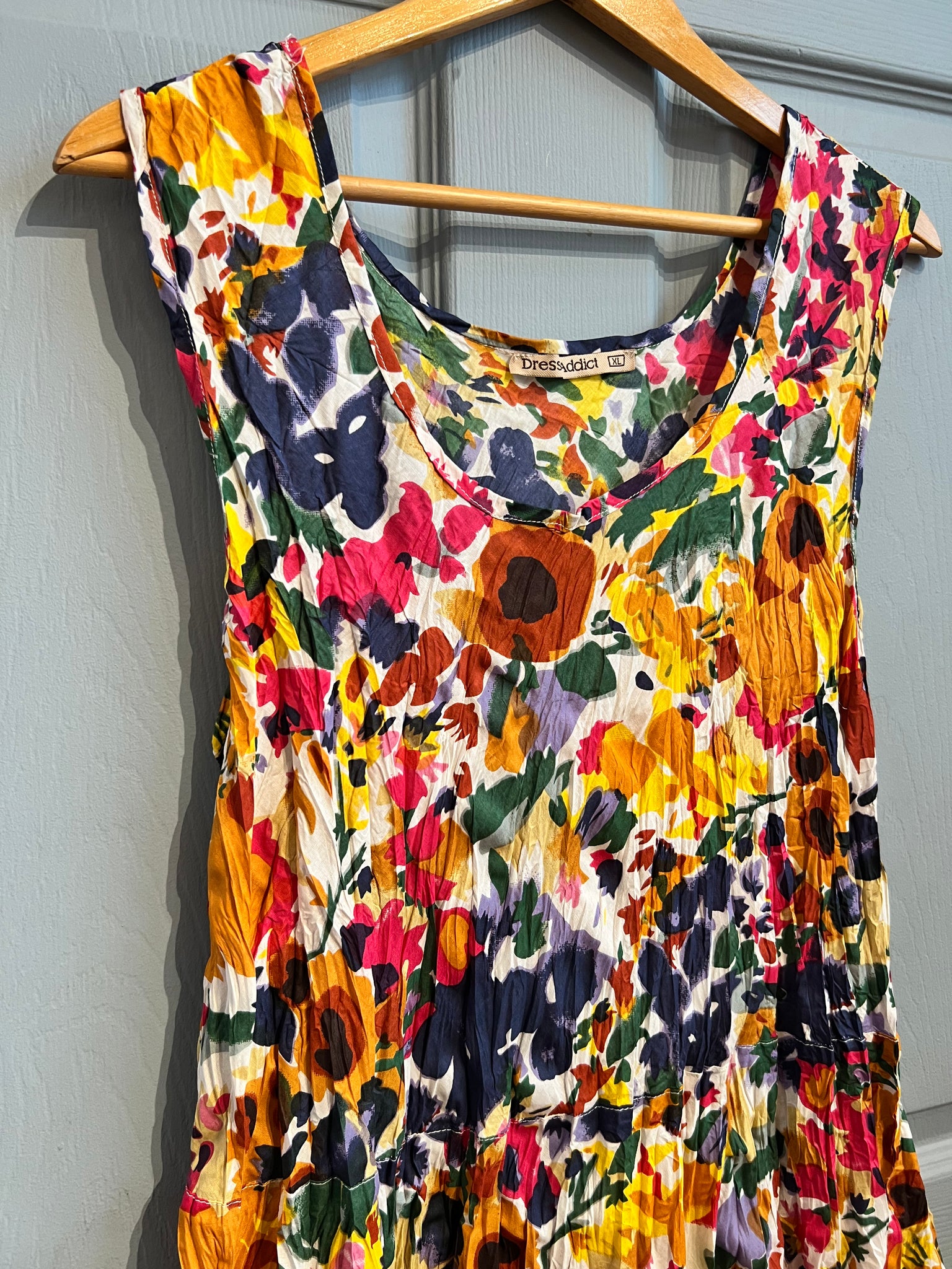 Tank top style with circular neckline! This sweet midi dress is made with two front pockets and and a tiered skirt :)