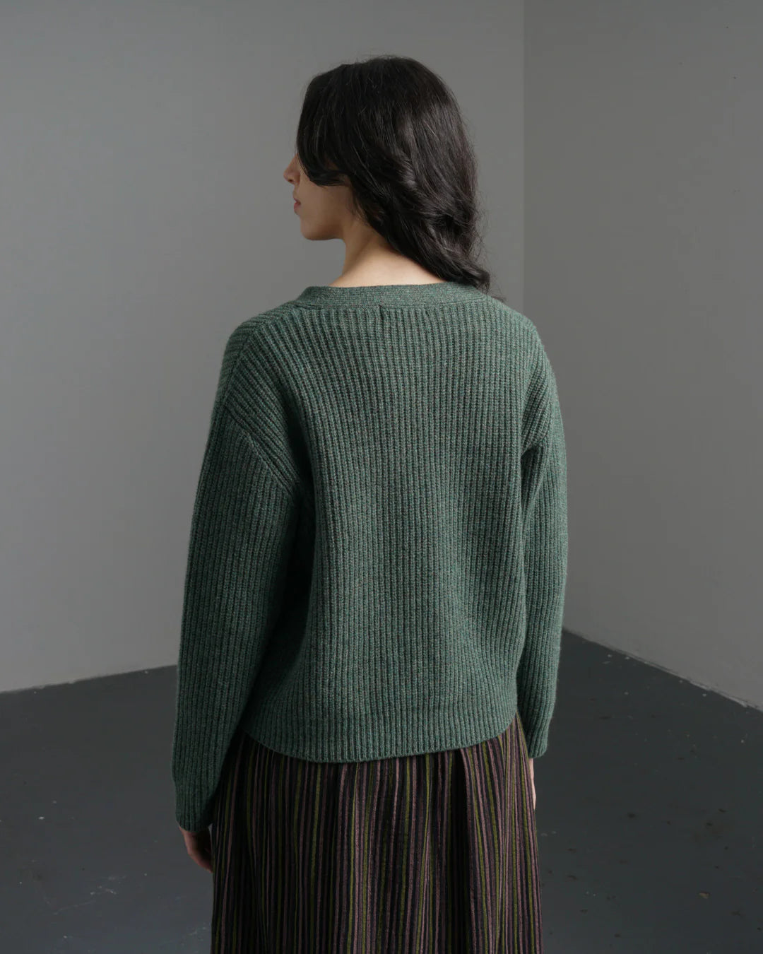 This Luxurious Fisherman rib knit cardigan is made in pure, soft mid-weight lambswool. A beautiful layering piece, it's easy to pair with skirts and trousers. It features a straight cut, slightly cropped fit, subtle drop shoulders, and a V-neck with a buttoned front, finished with imitation corozo buttons.