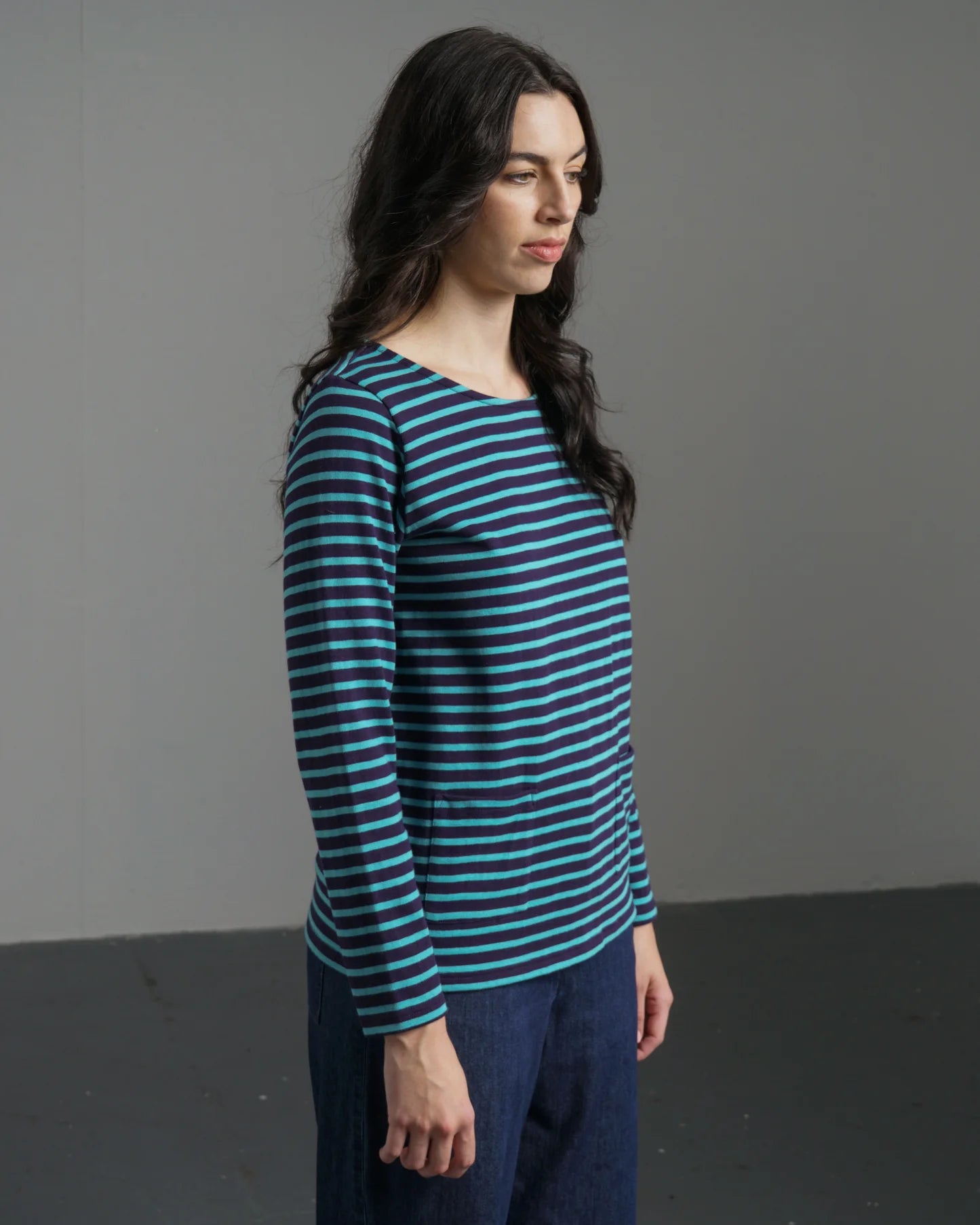 Our classic sailor T returns for Winter. Cut from rich, soft, organic cotton jersey, this timeless striped top is a true BIBICO staple. Designed with a boat neckline, twin-needle stitching, wrist-grazing sleeves and finished with two patch pockets. This season’s palette features two unique stripe combos: navy with retro blue, and navy with chartreuse — all custom-dyed and woven exclusively for us. The organic jersey cotton is mid-weight, soft and of a superior quality, making this a go-to layer with year-round appeal.
