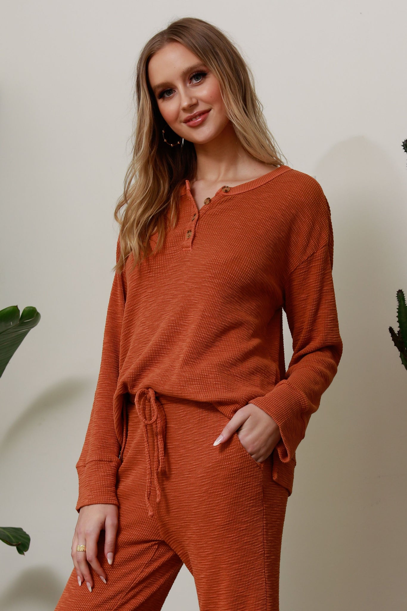 Relaxed fit long sleeve button front thermal top - perfect for getting cozy this summer or layering on a cool fall night.