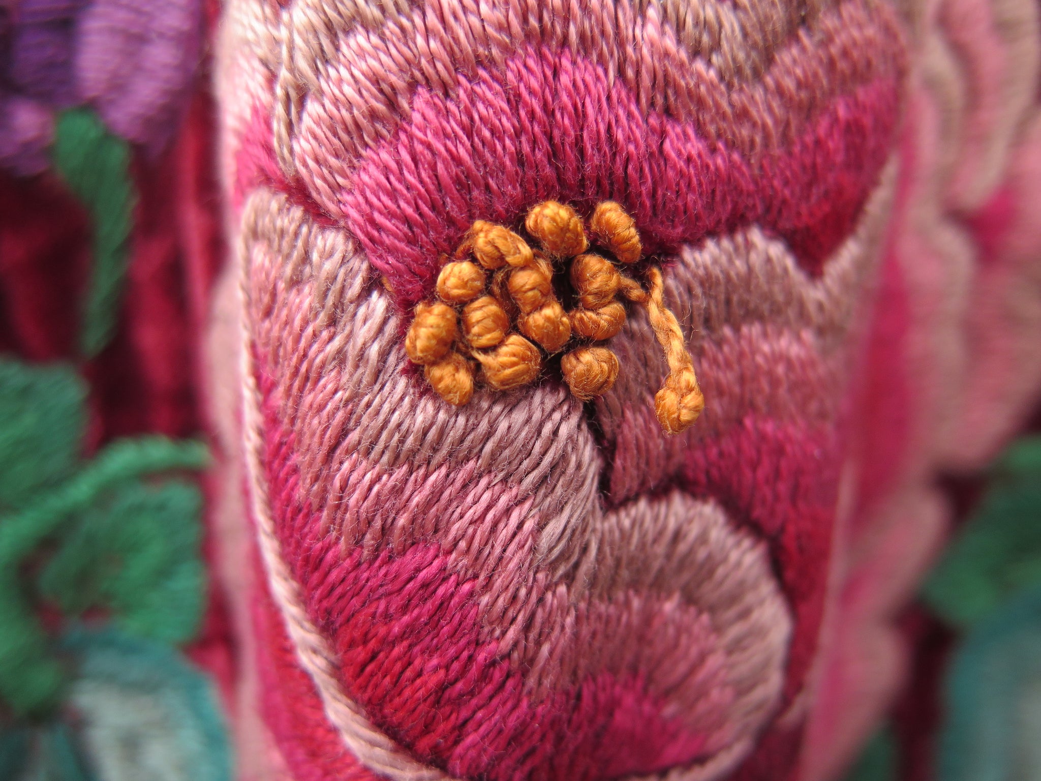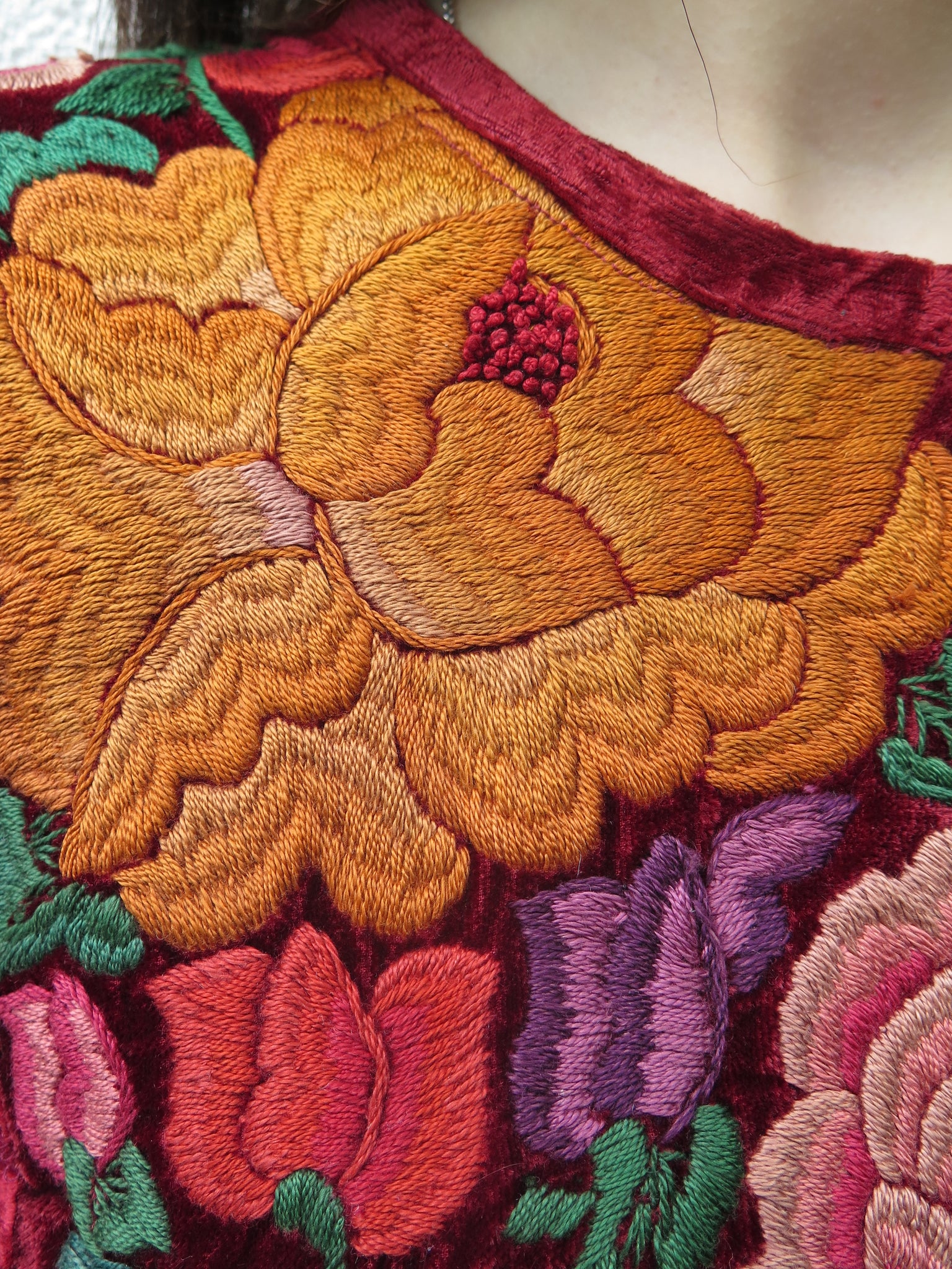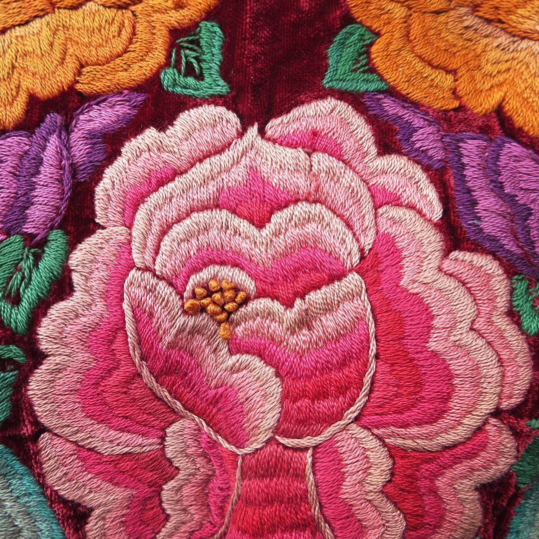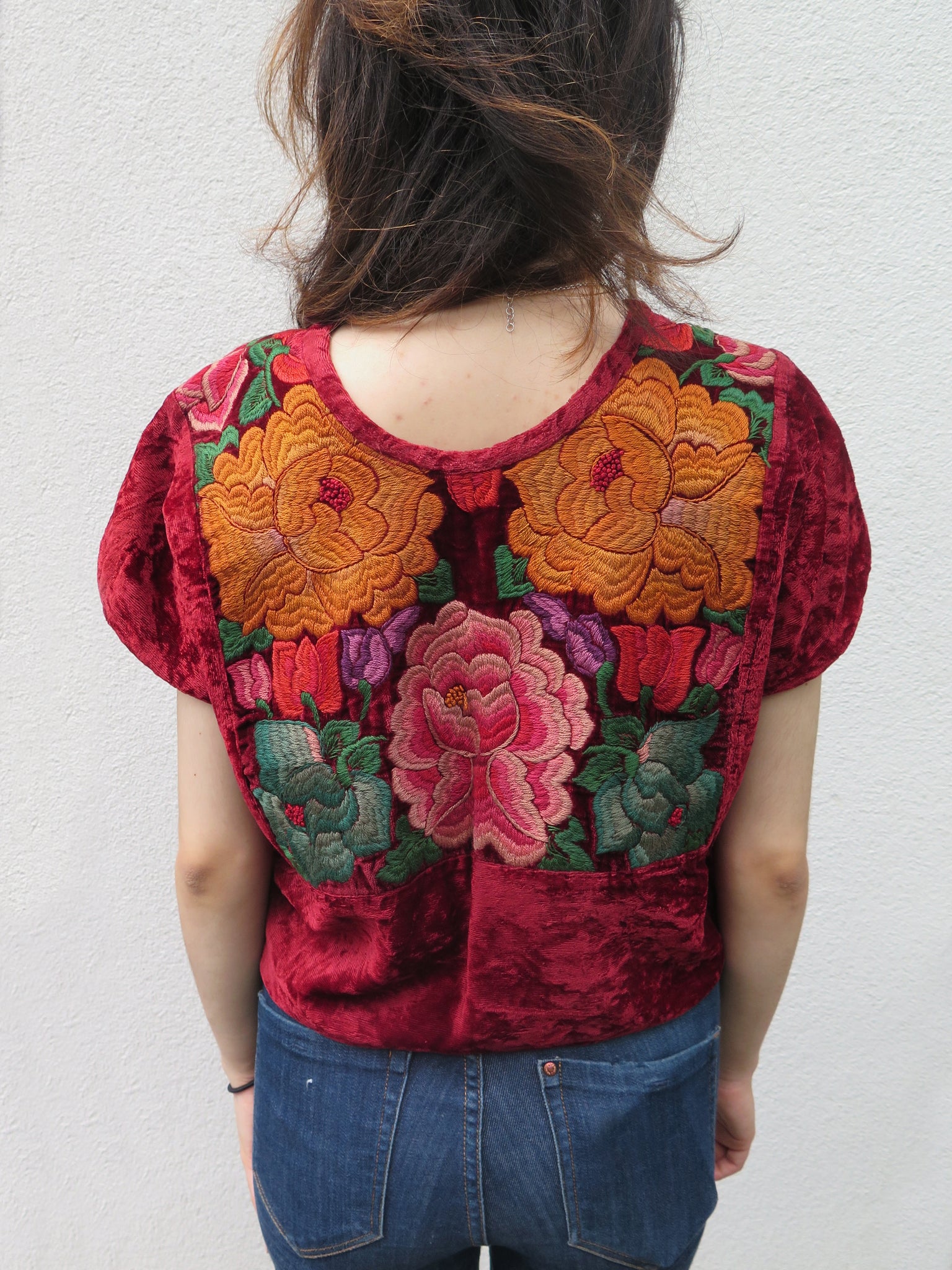 It's a real gem with bold flower blossoms embroidered in harmonious colors that meld perfectly with the silk velvet. The beautiful rose-pinks, forest greens, violets and warm marigolds make this an easy garment to wear no matter how you style it.Background fabric is a deep wine/ red silk velvet not to mention the beautiful silk print lining. This blusa is authentic and expertly hand-made - in overall great condition with no stains, slight pull on center of one flower (shown in close up).