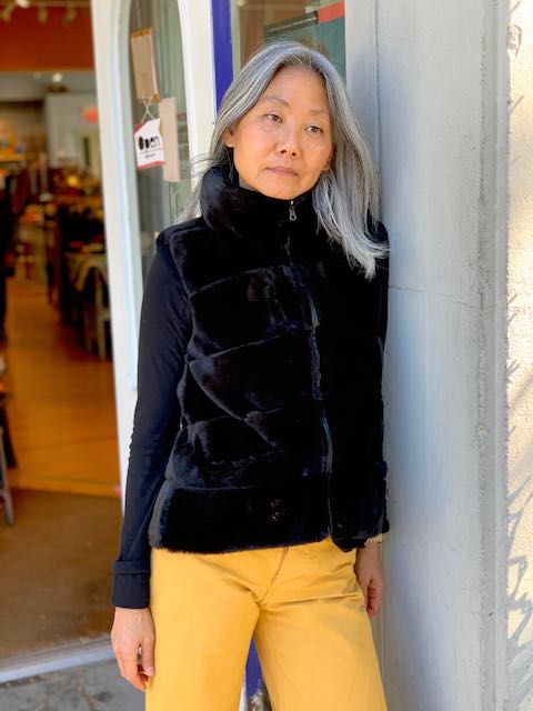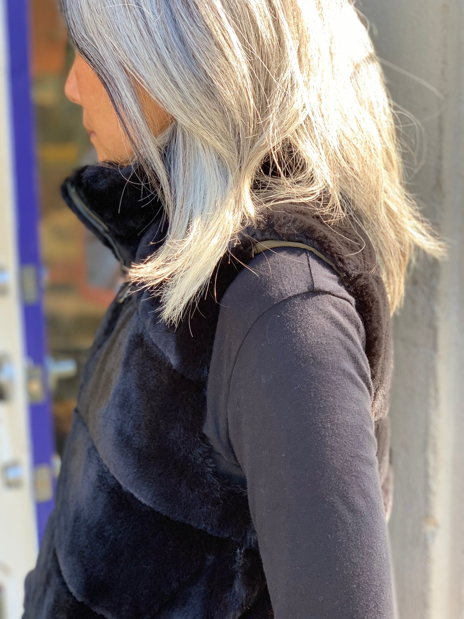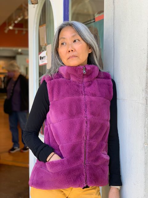 This ultra-soft faux fur vest works double-time with technical nylon on the reverse side. The hi-lo hem lays perfectly over a first layer and adds warmth and comfort, pockets on both sides.