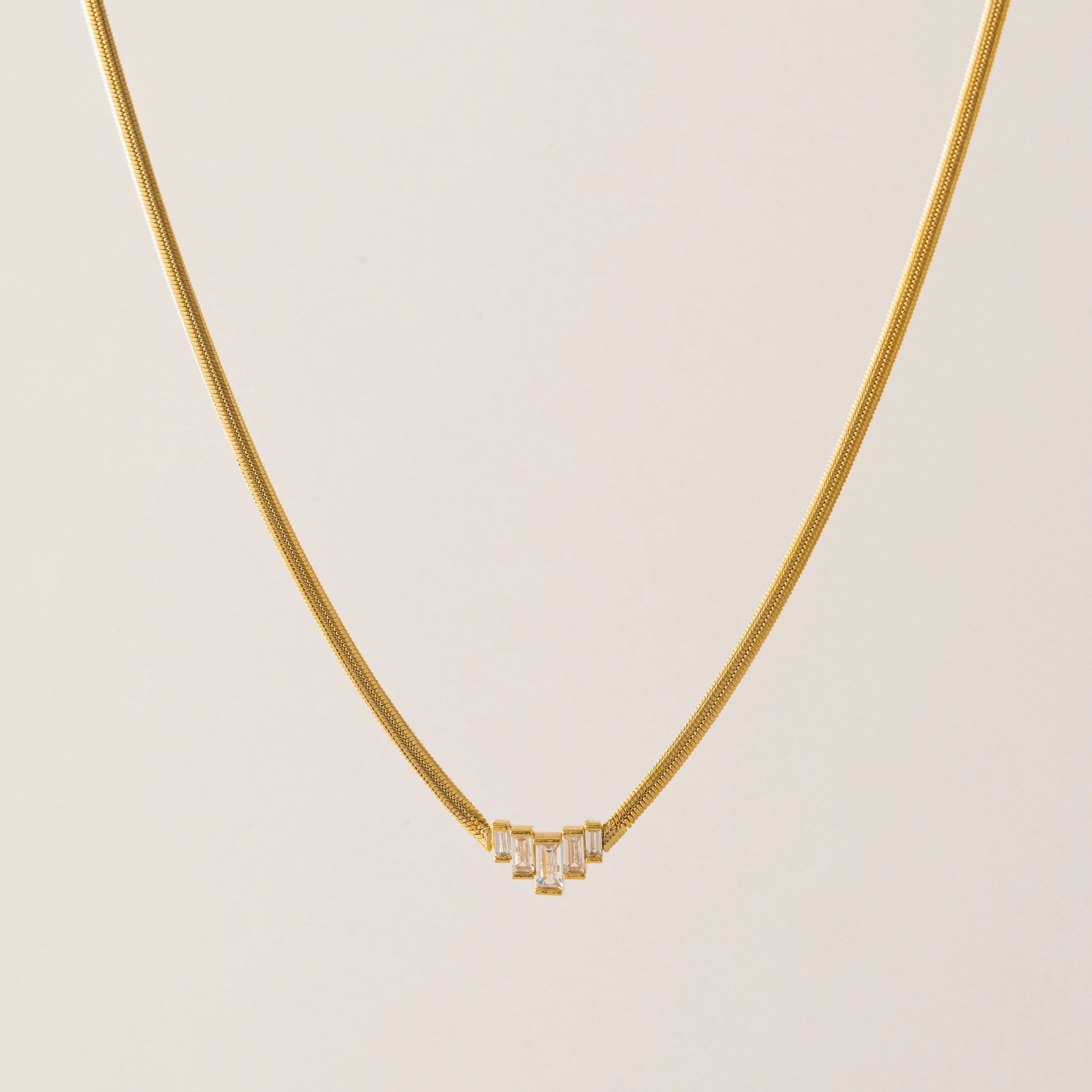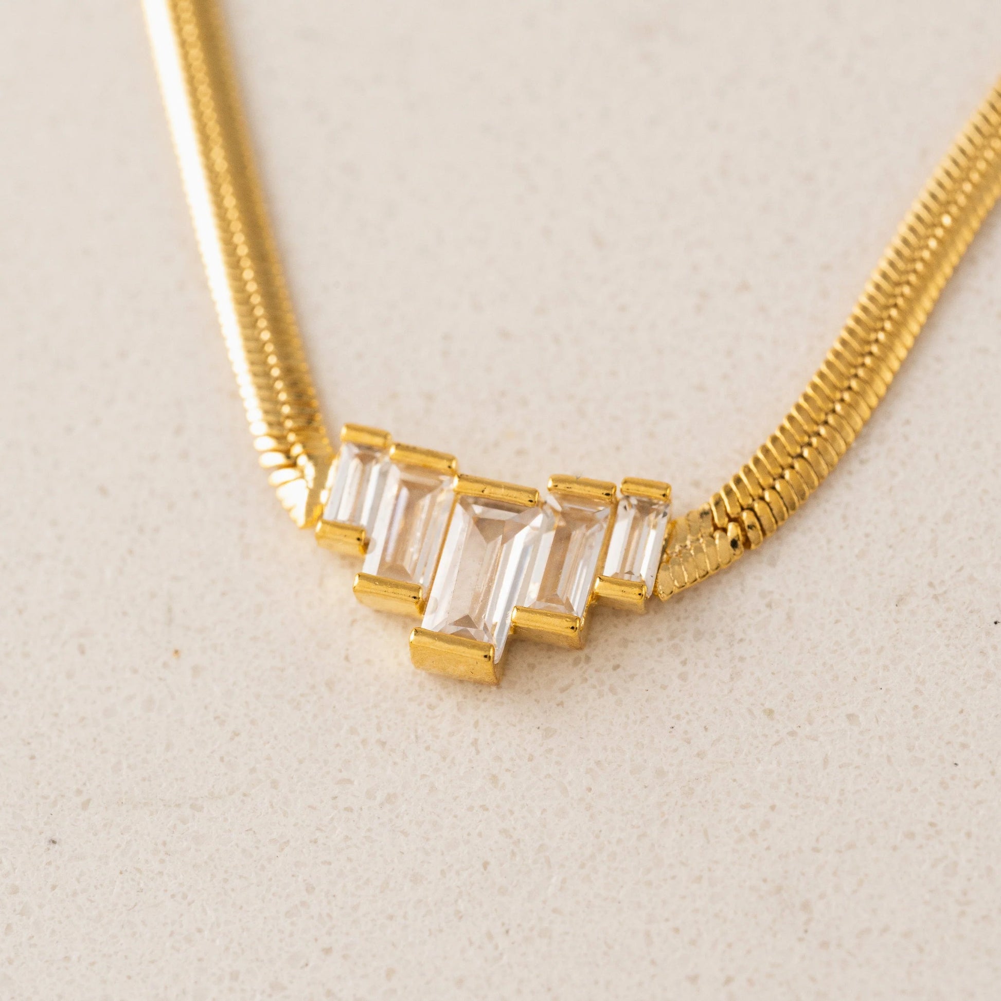 A crescendo of baguette crystals on a herringbone chain creates a look that's one part architectural, two parts glam.