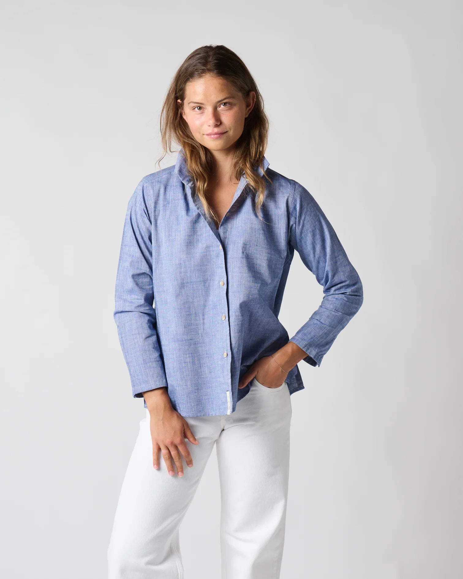Model is 5′5″, wearing Astrid S in Blue Chambray