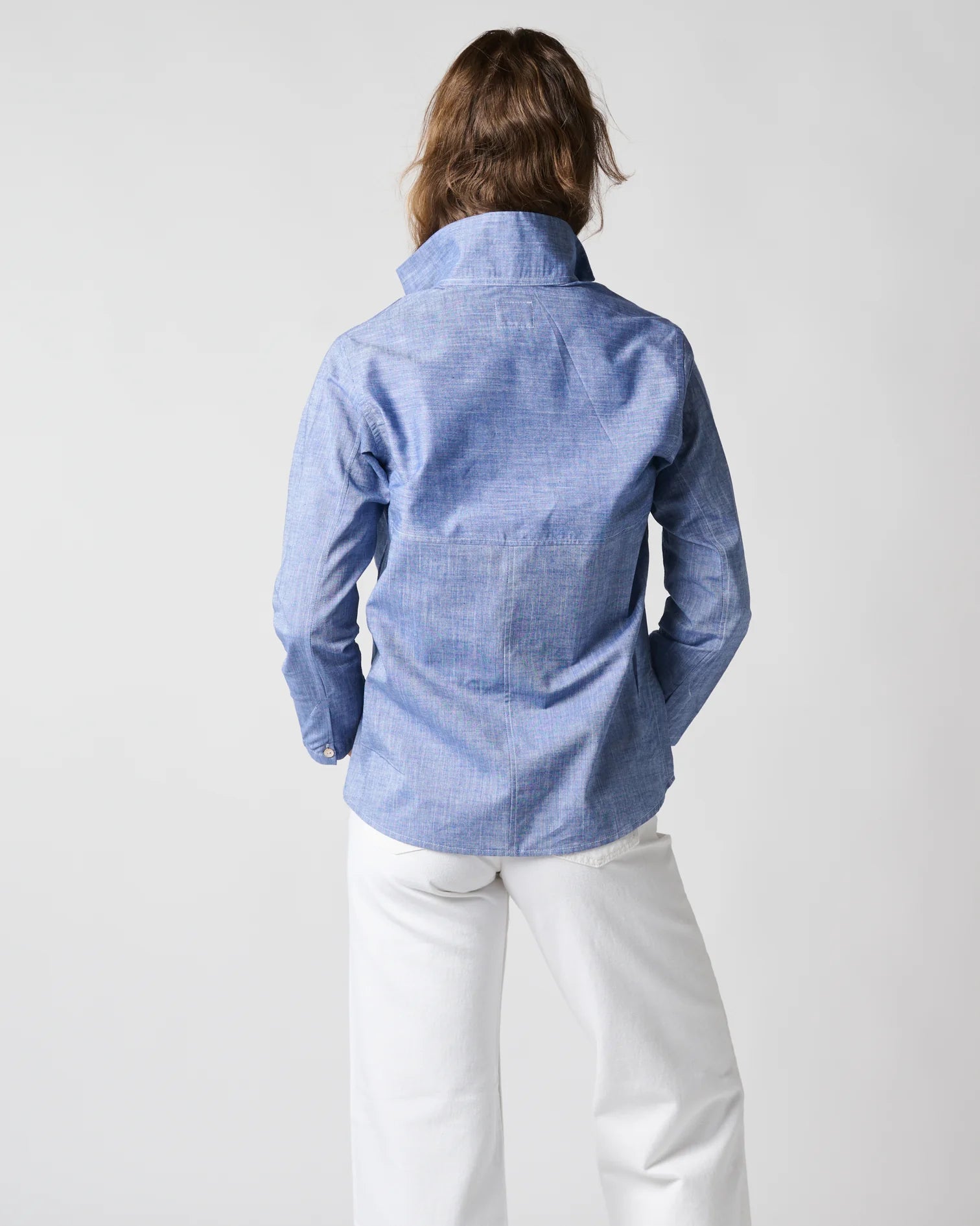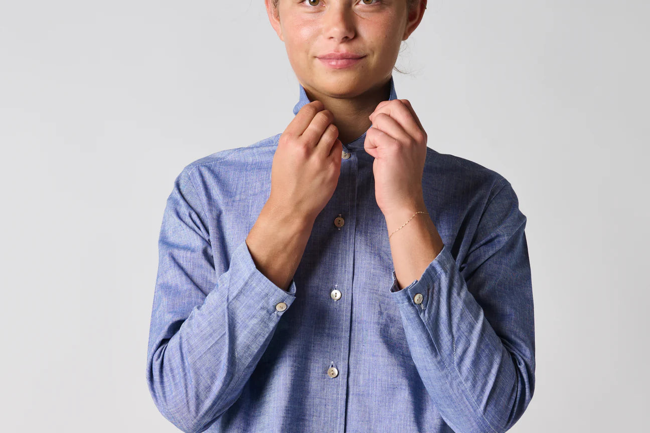 Astrid, the classic stand collar shirt—a bestseller and wardrobe essential. Constructed with a three piece back and subtle side slits. Our 94 Portland collection features chambray and seersucker fabrics, perfect for spring.