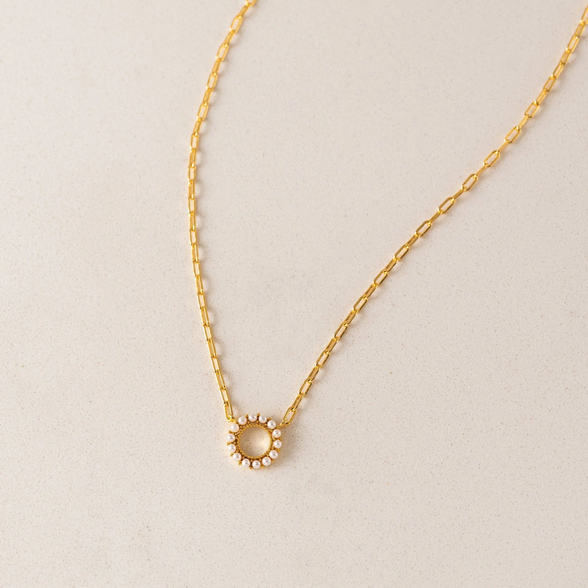 Add a little sparkle to any moment. A vintage-inspired pendant featuring faux pearls on a sleek, rectangle link chain.