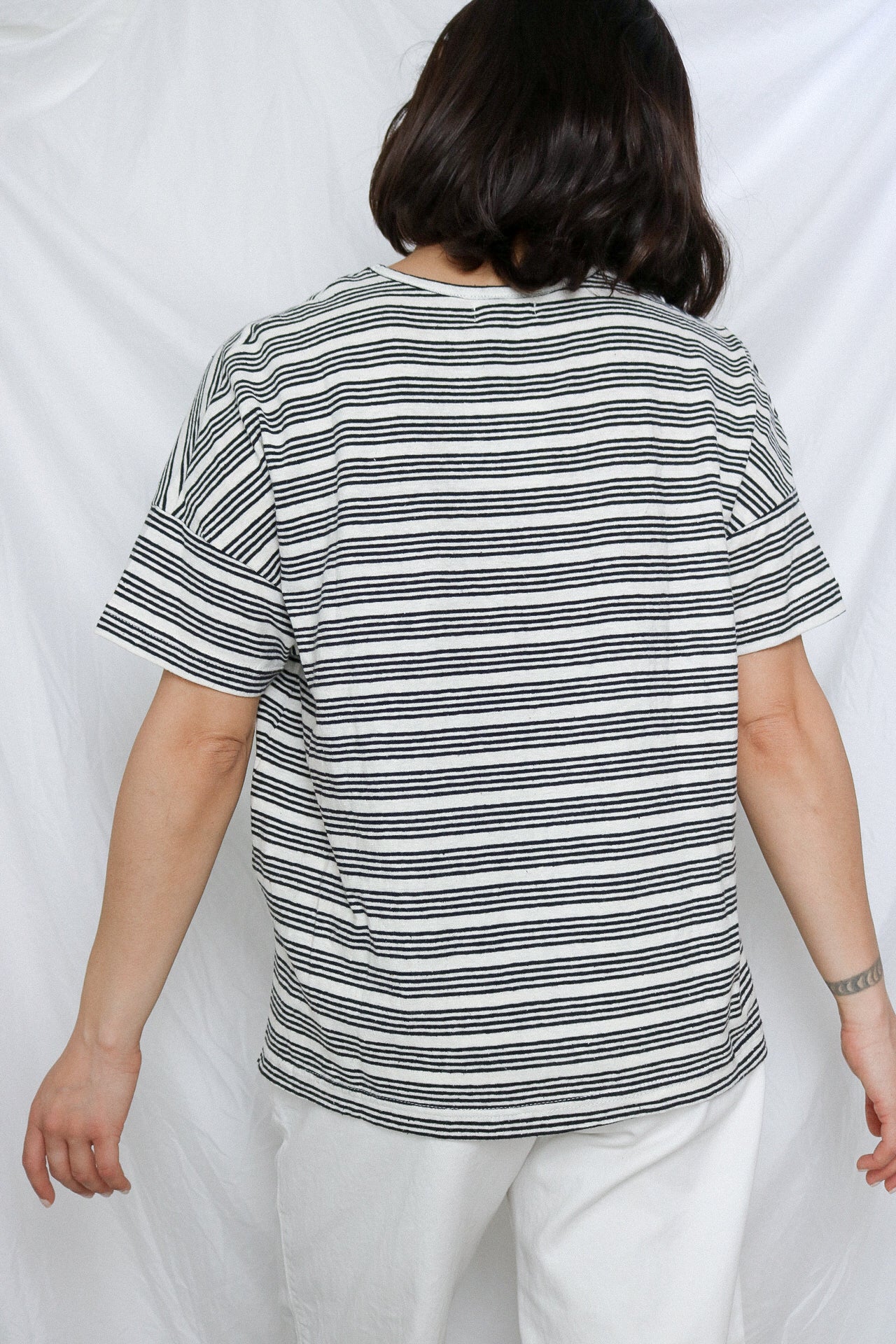 A generous V-neck, stripes and asymmetrical lengths come together in this sophisticated tee that boasts both style and top-notch ventilation, even on the hottest summer days. Need we say more?