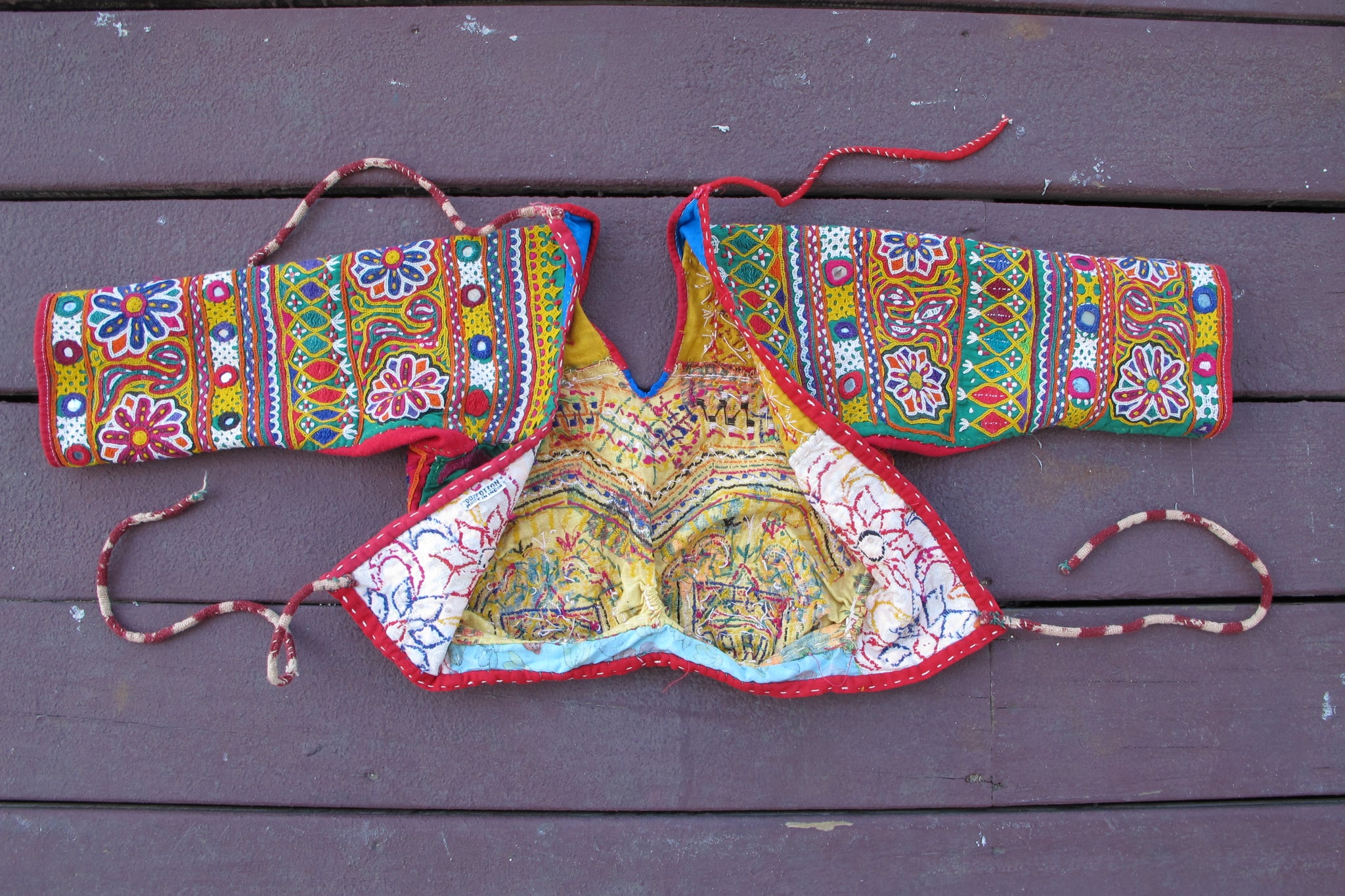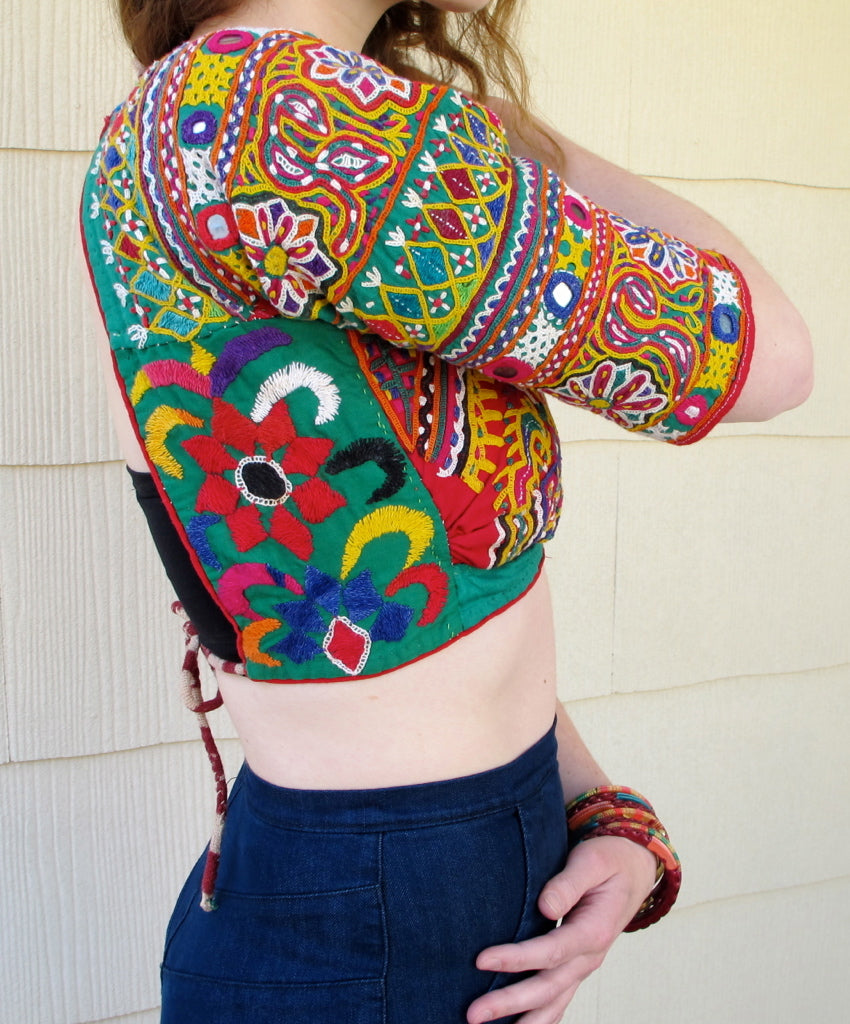 This vintage Indian top, called a choli, was traditionally worn with the back exposed and a flowing sari skirt on the bottom. As pictured, it can also be worn with a bandeau and high waisted bottoms!